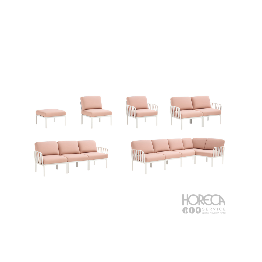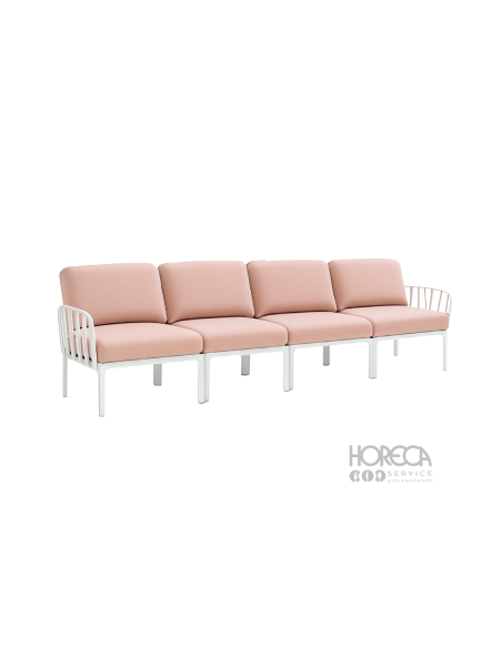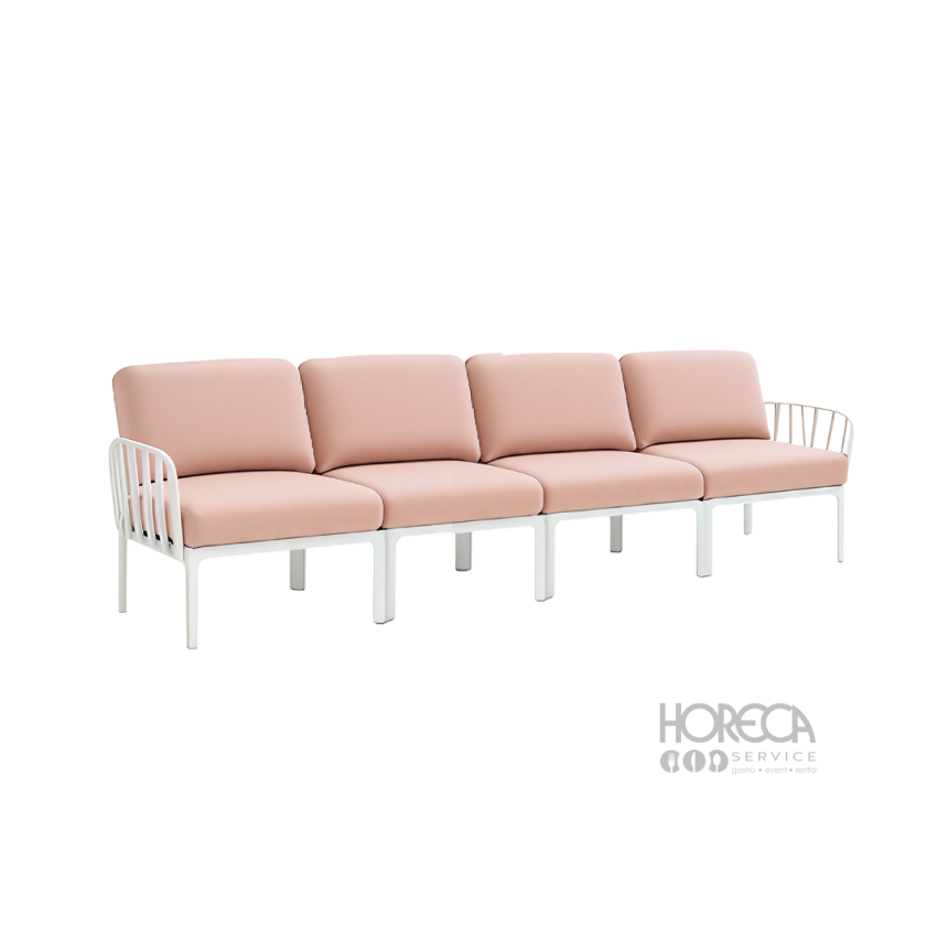 Sofa Komodo 4-osobowa to idealne rozwiązanie dla większych stref wypoczynkowych. Jej różowe poduszki w połączeniu z białą ramą tworzą elegancki i świeży efekt, który doskonale pasuje do eventów, hoteli, restauracji czy plenerowych stref lounge. Dzięki modułowej konstrukcji systemu Komodo mebel można łatwo dopasować do indywidualnych aranżacji.